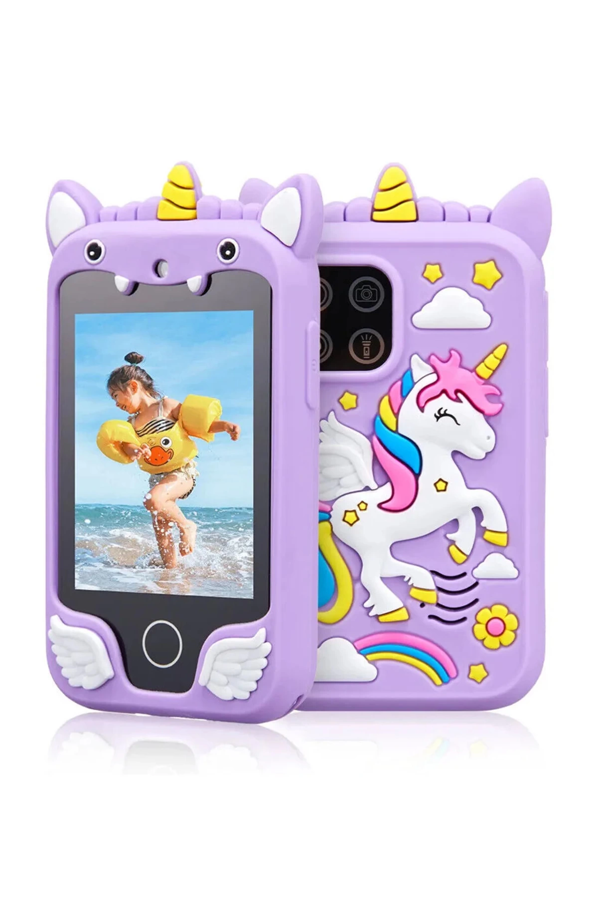 Çocuklar İçin Eğitici Telefon Dokunmatik Ekran Çift Kameralı Fenerli Müzik Çalar Oyun Video Mor