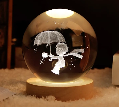 Dekoratif Küçük Prens Tasarımlı Ahşap Altlıklı Işıklı Cam Küre Cam:6cm Ahşap:2cm