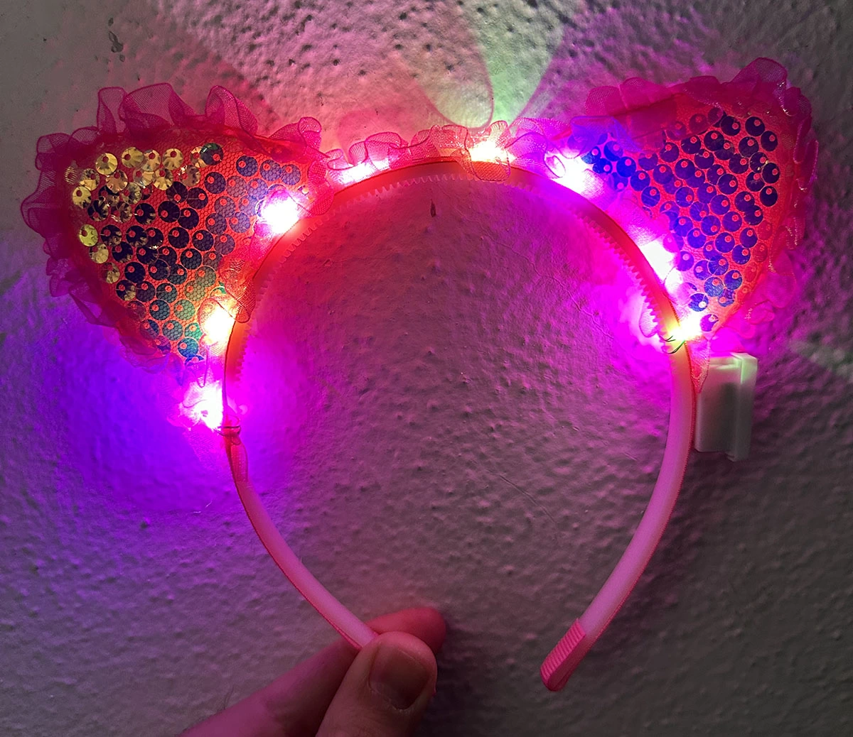Eğlencenin ve şıklığın bir araya geldiği Kenarları Dantelli Fuşya Pullu Payetli Led Işıklı Kedi Kulak Taç ile partilerin yıldızı olun