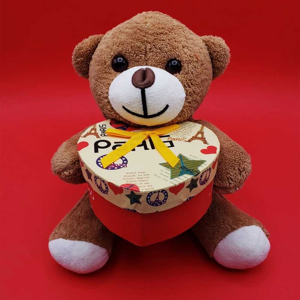 Peluş Ayıcığın kucağındaki kalpli kutu bu ürünü daha özel bir hale getirir.