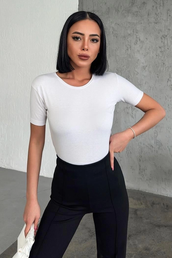 -Bu muhteşem kısa kollu bisiklet yaka likralı beyaz viskon penye body, gardırobunuzun vazgeçilmez parçalarından biri olmaya aday! Rahatlığı ve şıklığı bir araya getiren bu body, her an tarzınızı yansıtabilir ve kendinizi özgür hissettirecek.