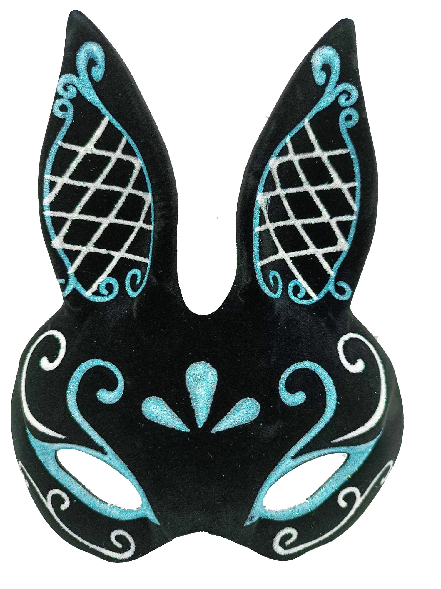 Gizemli ve büyüleyici bir görünüm için siyah süet kaplama, mavi beyaz simli tavşan maskemiz tam size göre