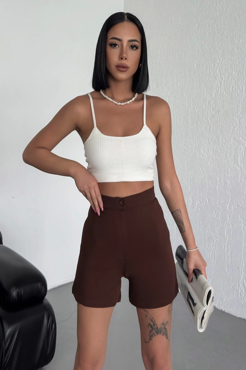 -Gardırobunuzun canlı ve enerjik parçası haline gelecek bu kahverengi krep şortu, favori tişörtünüz veya gömleğinizle kombinleyerek kişisel tarzınızı yansıtabilir ve her ortamda dikkat çekici bir görünüm elde edebilirsiniz.